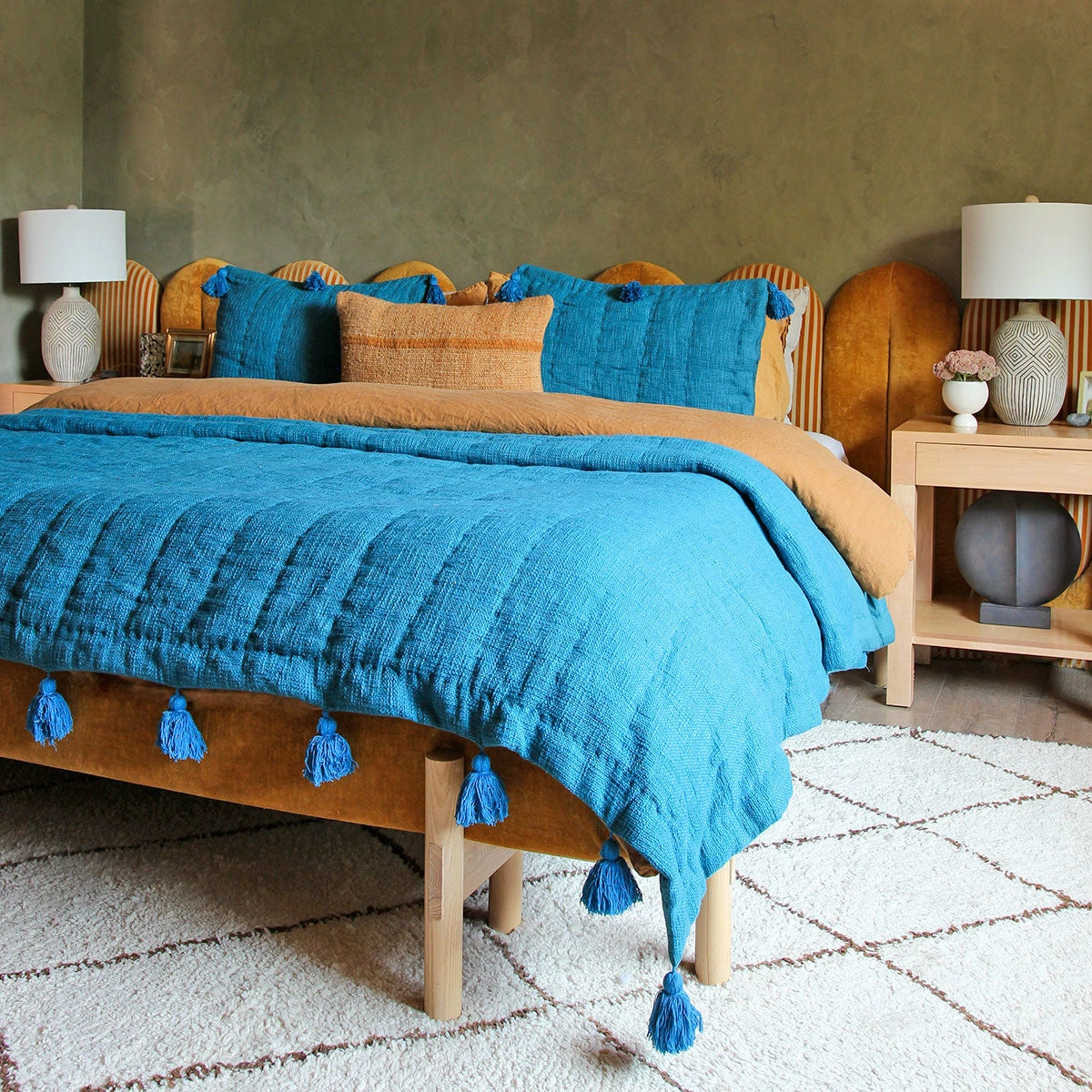 This Deep Ocean colored bedding makes us dream of being surrounded by vibrant, blue waters and calm, rolling waves. In the springtime, mix your quilt with brighter hues, bold shams & pillows, and lightweight throws. It easily transitions to the fall months when paired with autumnal, earthy tones & cozier knit throws, too! The quilt and shams are sold separately, so you can mix & match with the colors of your choosing!