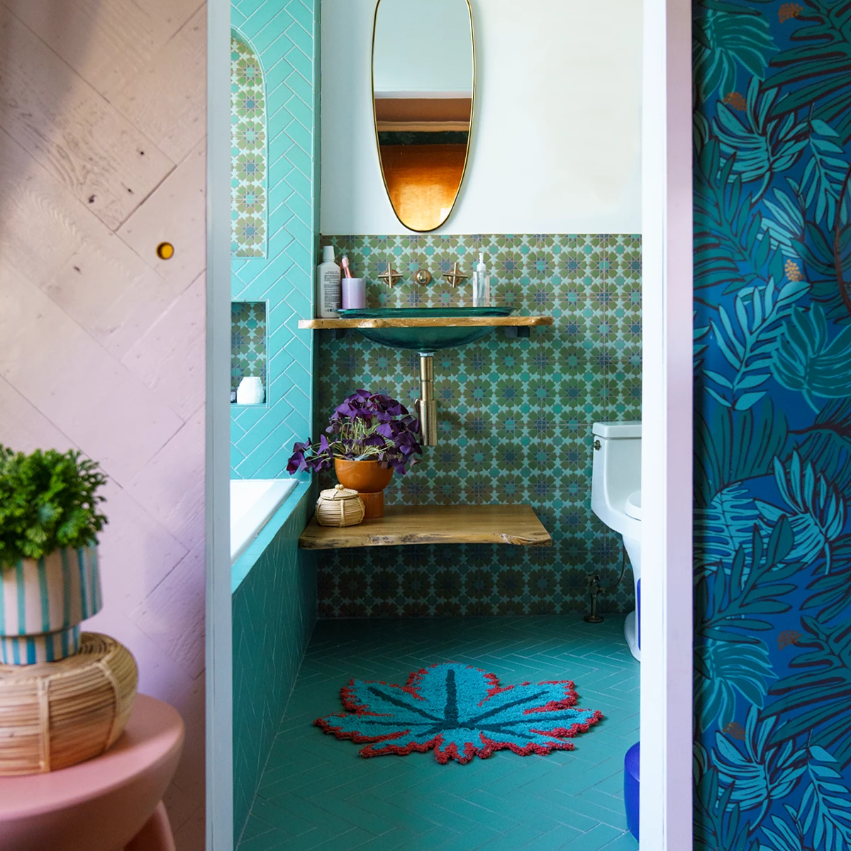 We’re loving the bold contrasting colors of the teal leaf motif against the fresh peachy-orange background on our Mary Jane Mat! Perfect for the side of your bed, entry way or for when you step outside the shower! Mary Jane is one of our favorite icons at Jungalow — she’s an easy-going girl who loves getting cozy, snacking, and chilling out in comfy spaces!