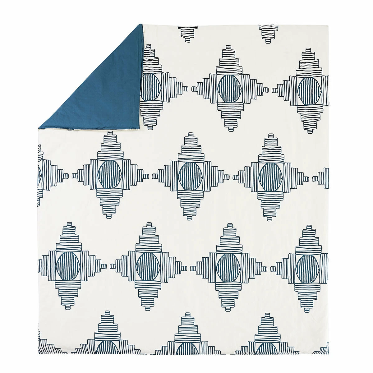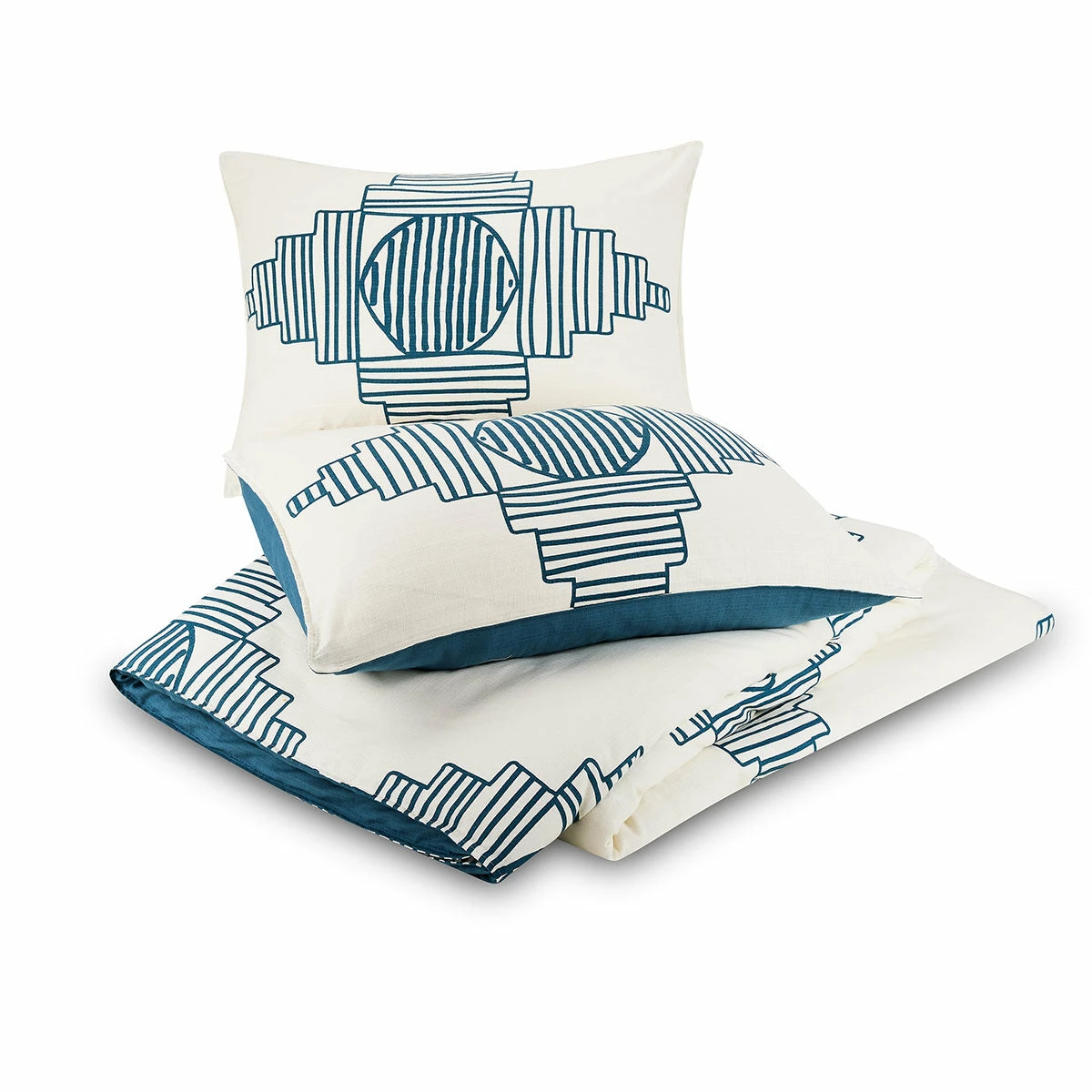 Inspired by sound waves and our favorite tunes, our All Dance duvet set is bringing the beat to the bedroom! With its graphic motif and beachy color palette of rich teal blue & soft sandy cream, this duvet is all about ushering in those good vibes. The patterned front features a geometric motif in teal blue on solid cream, while the backside is solid teal blue for contrast.