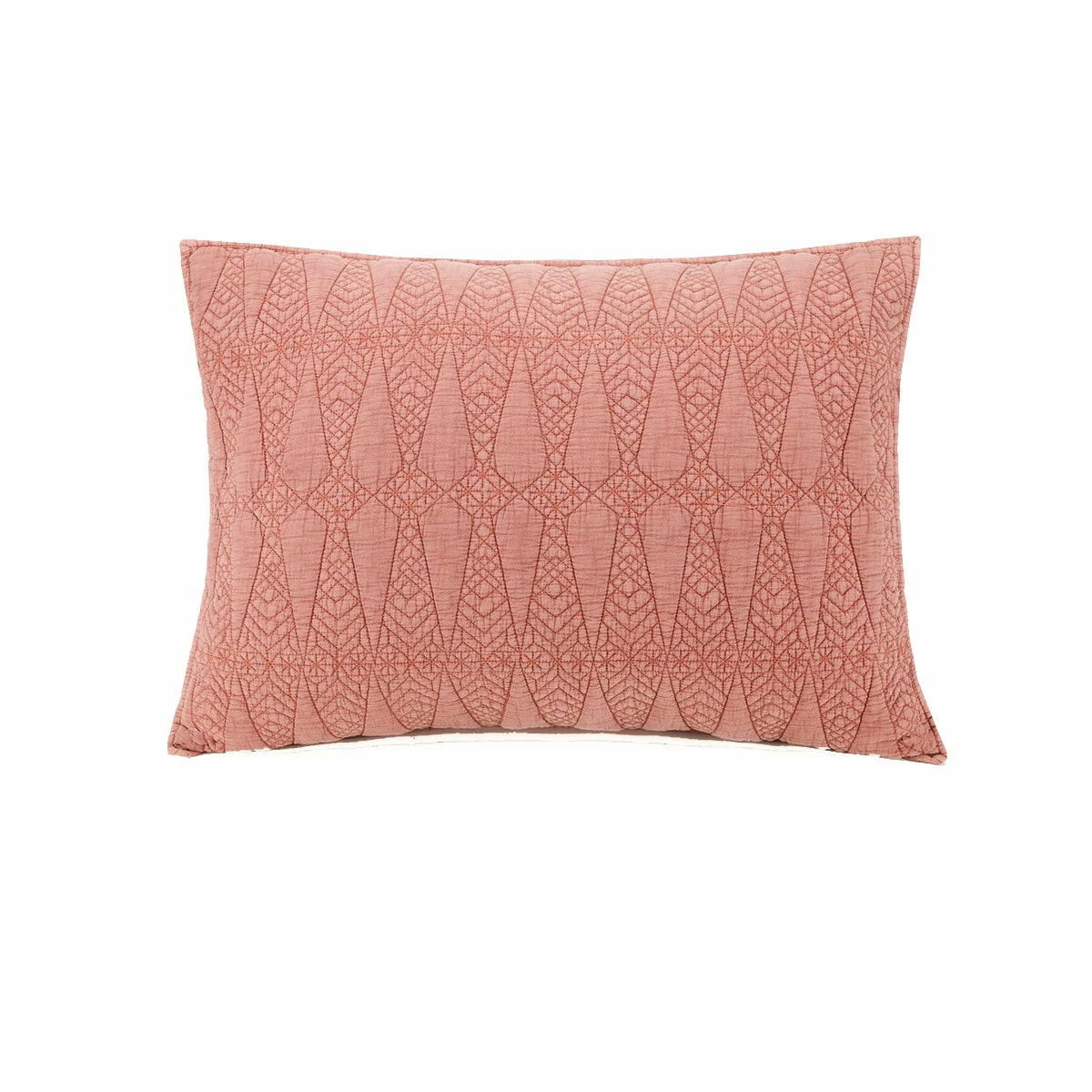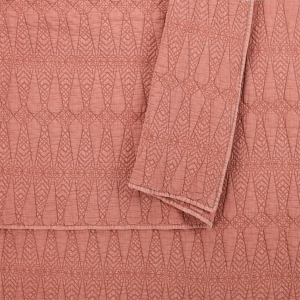 The modern geometric quilt stitching pops against the dark blush/salmon-colored color. It pairs beautifully with a rich turmeric yellow and all your leafy green friends!